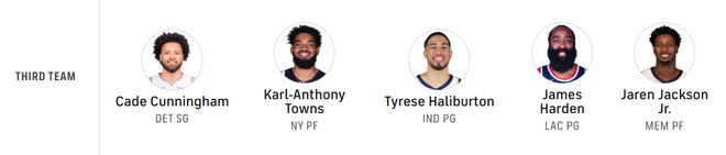 三阵:坎宁安、唐斯、哈利伯顿、哈登和小贾伦杰克逊