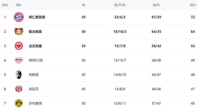 在积分榜上,拜仁以72分高居榜首。勒沃库森只拿到64分,排名第2。第3的是法兰克福,只拿到52分。莱比锡以49分排名第4。弗赖堡48分排名第5。美因茨47分排名第6。多特蒙德只拿到45分,排名第7。多特蒙德要想杀入欧冠区,难度极大。